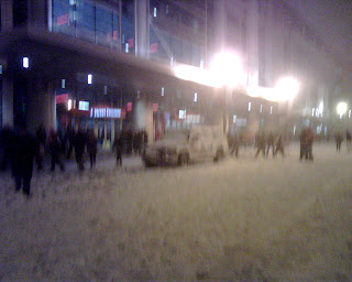 The Caps beat the Thrashers 5-2 in an exciting game that started when you could see DC's streets and ended with several inches of snow on the ground. Part way through the game the announcer came on to warn people that DC's buses were stopping at 9 and the metro was ending above-ground service at 11. What was most impressive was how full the arena was in spite of the terrible weather. All of DC has been panicking about this storm for several days, the grocery stores are empty, and yet, Caps fans showed up.
